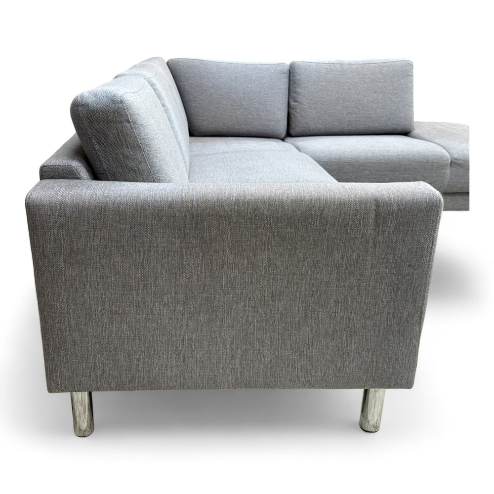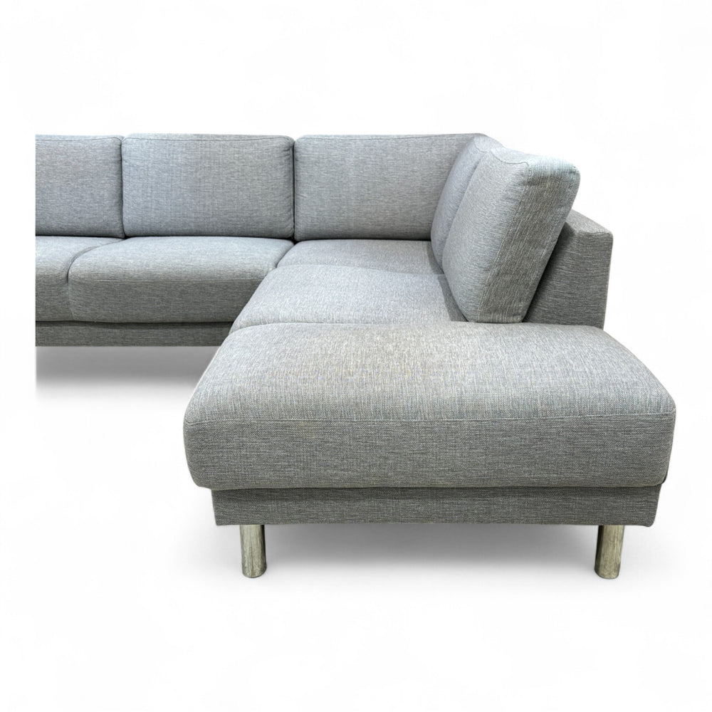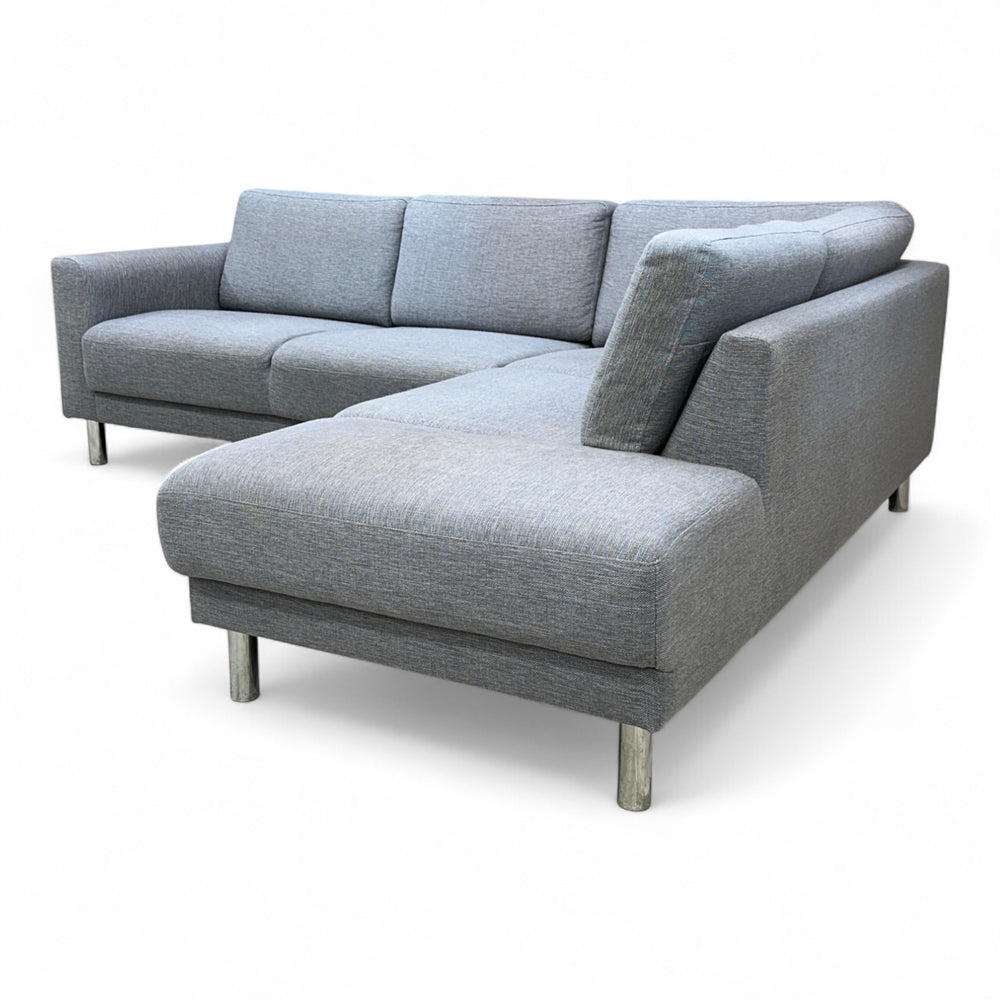 Praktisk hjørnesofa med åpen ende høyere, trukket i lysegrått stoff som passer godt inn i moderne interiør. Sofaen har ryggputer med avtagbare trekk som gjør vedlikeholdet enkelt, og byr på både komfort og stil i stuen.