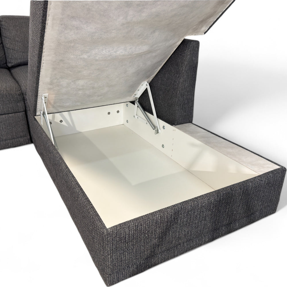 Grå hjørnesovesofa med uttrekkbar sovedel og praktisk oppbevaring under sjeselongen. Sofaen har en veldig myk sittekomfort.