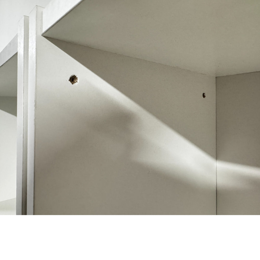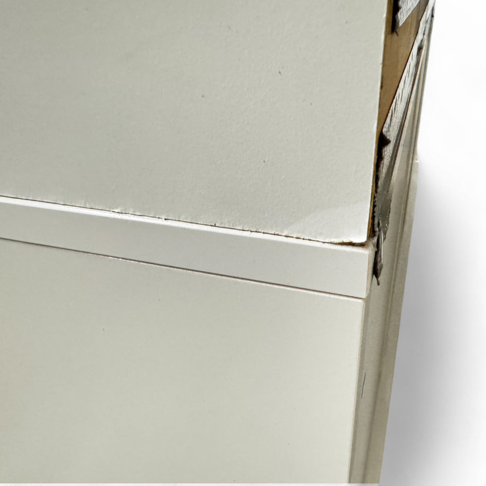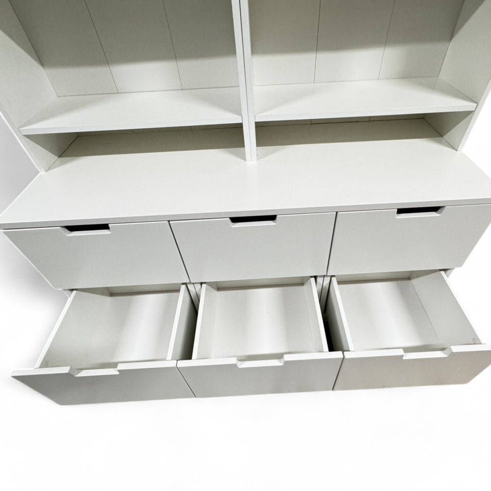 Romslige IKEA bokhyller i hvitt med integrerte skuffer og softclose mekanisme, perfekt til organisering og oppbevaring. Vasket og klar til bruk.