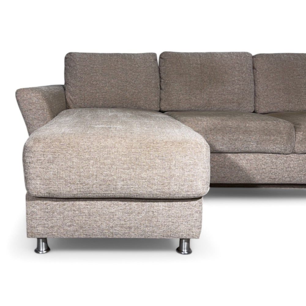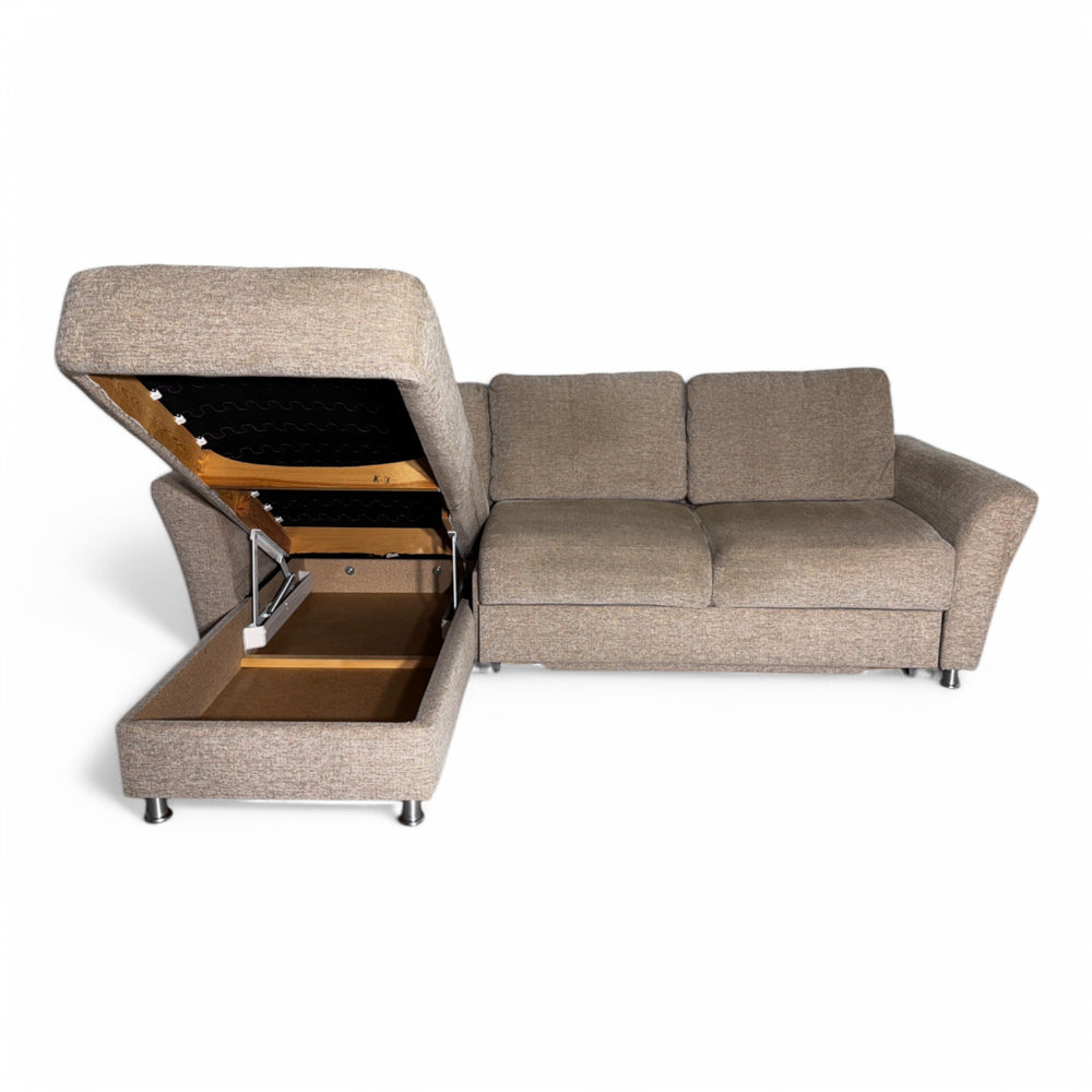 Sovesofa med sjeselong fra Hjort Knudsen i beige farge. Sofaen har en uttrekkbar sovedel og oppbevaringsplass under sjeselongen. Ryggputene har avtagbare trekk. En funksjonell og komfortabel sofa med middels myk sittekomfort.