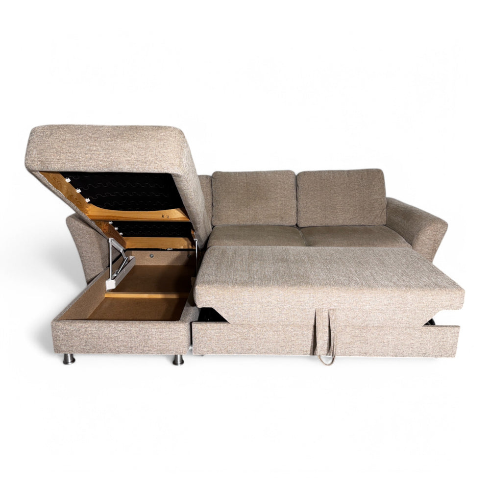 Funksjoner: Uttrekkbar sovedel, oppbevaring under sjeselongen, avtagbare putetrekk på ryggputer